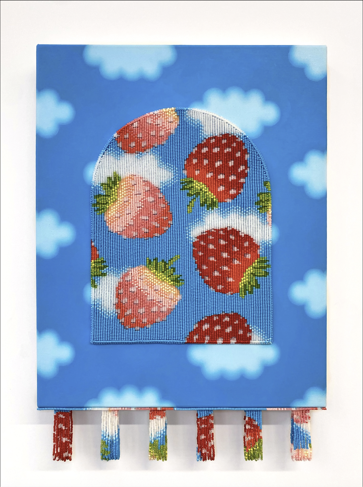 Sierra Barber creates subtle storied objects with perfect stitches and an exquisite colour palette. Throughout her artistic practice she has been drawn to processual work that relies on time, precision, and care. Sierra is a painter. She has worked in encaustic, oils, and more recently beads. She joined the OCADU beading circle, and like many of us, picking up the needle was a gesture of connection and resilience. In these new “sister” pieces, the artist continues to develop imagery she has explored over three years: skies, clouds, flowers and strawberries. Those four subjects, like her work, carry a basket of stories. Although not literally present, there are quiet references to Sky Woman, Atsit'saká:ion (Mature or Ancient Flower). The flowers carefully placed on sky blue fields pay homage to her and the plants that grew from her body. In Portal (2024), ken’niyohontésha, the life-sustaining strawberry, falls like manna from the sky. Strawberry seeds become sky-tears.